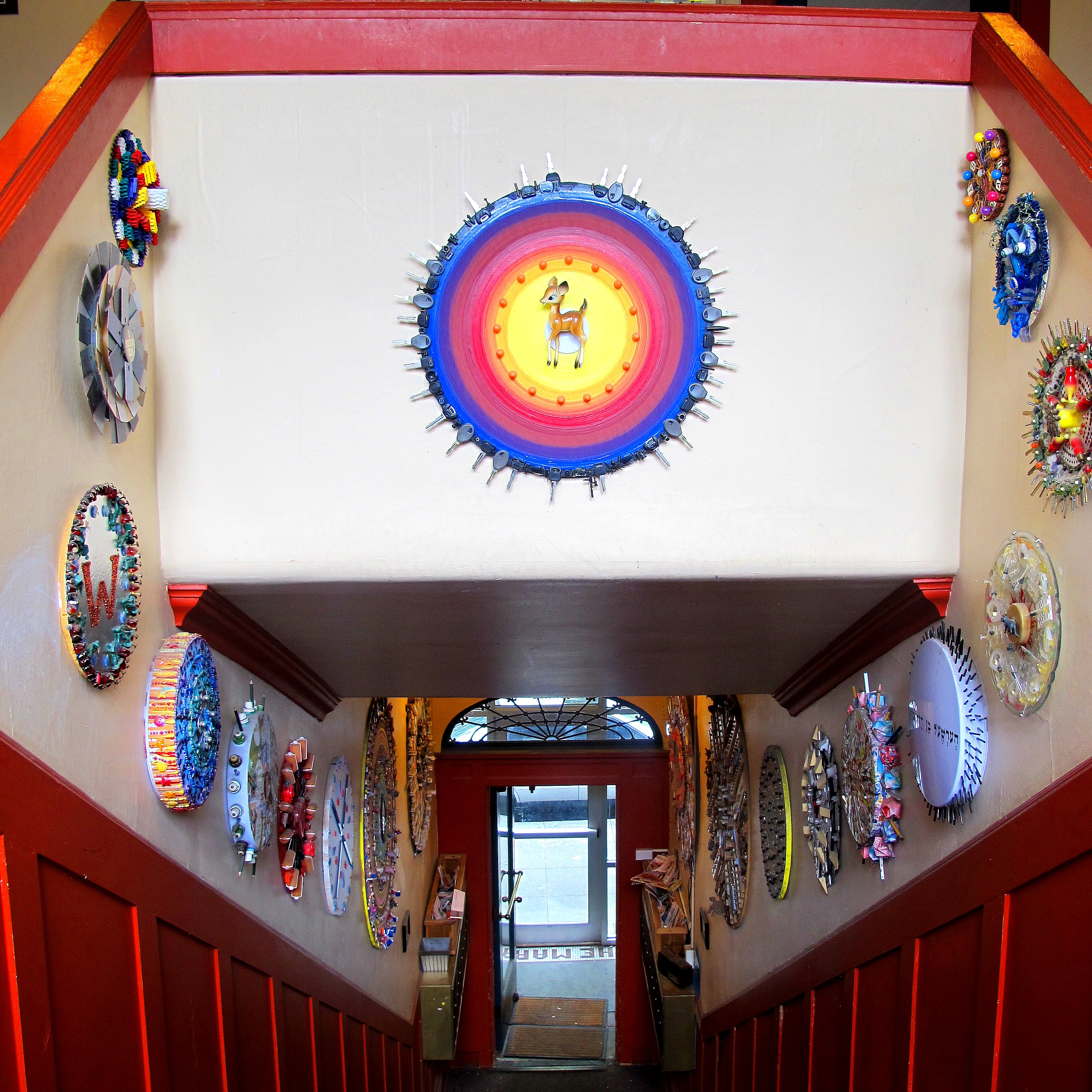 Downtown Olympia has a lot of character: Old buildings are maintained with dignity and wit, without being beautified, and, as I noted below, art is everywhere, inside and out. Behold what we get to see in the stairwell of my residence. The collages, by David Scherer Water, are dazzling.